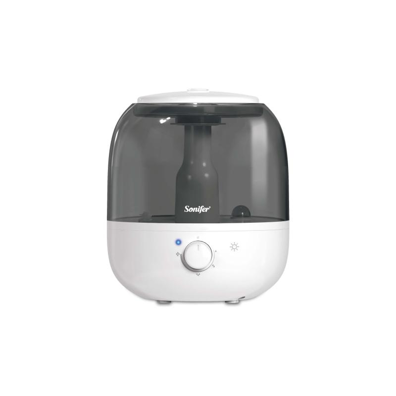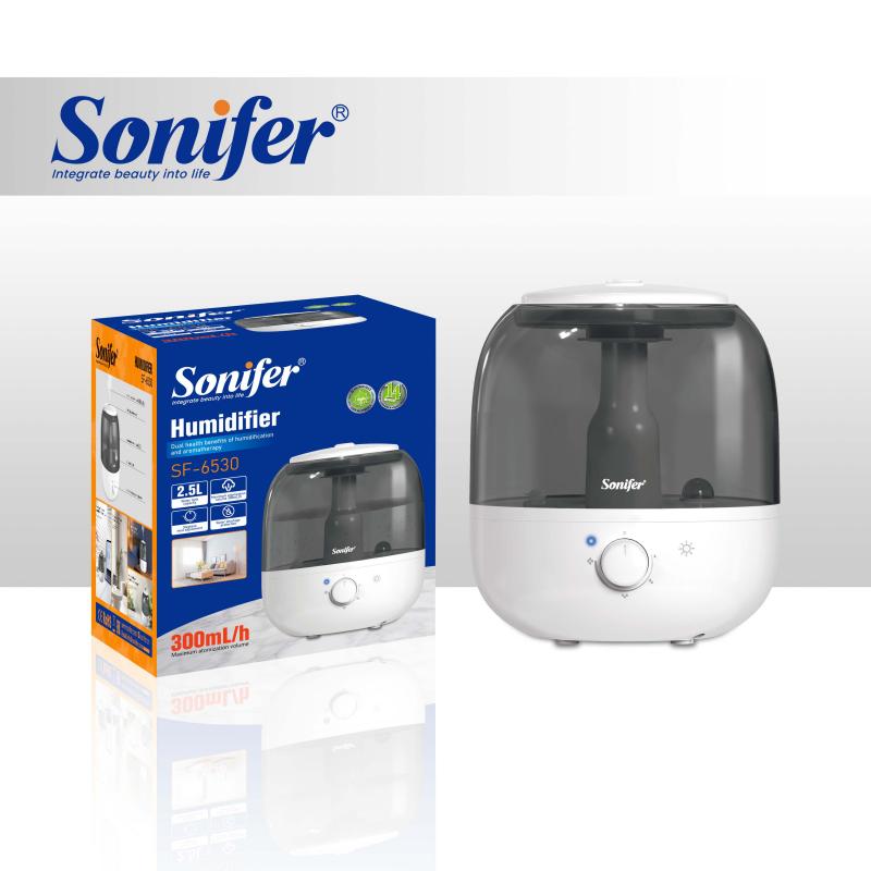The Sonifer SF – 6530 ultrasonic humidifier features 300mL/h atomization, 9h mist, a 2.5L detachable tank, 360° nozzle, stepless knob control. It has a night light, essential oil diffuser, <35dB noise, and safety mechanisms (21W).
